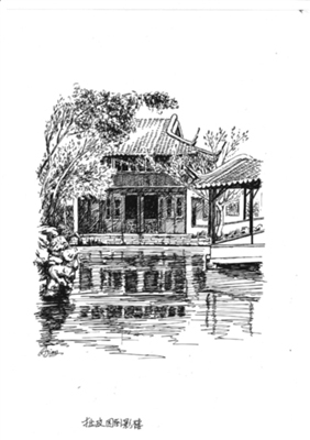 倒影楼(拜文揖沈之斋):位于拙政园西花园东北隅,临水而建,楼高二层,上下各名,坐北朝南,面阔三间,三面绕回廊。楼上倚窗可居高临下观水中倒影,站在楼东侧水廊上又可看楼影倒映水中,故名。旧时在此可眺望园外油菜花田,故曾称“菜花楼”。倒影楼与“宜两亭”遥遥相对,互为对景。楼下称“拜文揖沈之斋”,斋内东西两壁上嵌有明代文徵明、沈周半身像和传记,以及文徵明撰书的《王氏拙政园记》和张履谦《补园记》等书条石,为纪念两位著名文人,故名。