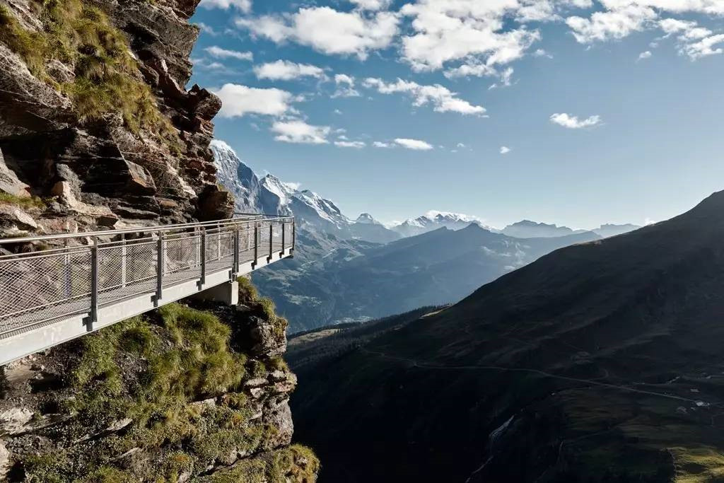 而作为山的国度的瑞士,为彰显自己对国家山山水水的热爱和赞叹,搭建了各种交通设施,带领人们在空中穿越陡峭的山崖、横跨河流,俯瞰瑞士绝妙的风景。其中最值得体验的是位于世界文化遗产的小镇格林德瓦(Grindelwald)的菲斯特(First)的FirstCliff Walk。