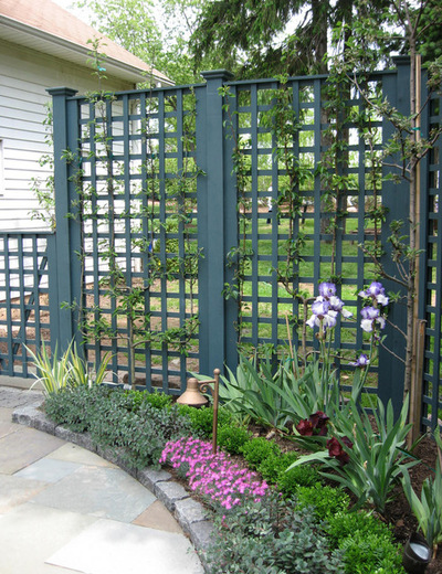 如图片上花园的主人那样,将深色格子架将四周圈起来,通过栅栏和爬藤植物营造出一个郁郁葱葱的秘密花园。格子架的利用又上升了一个空间。