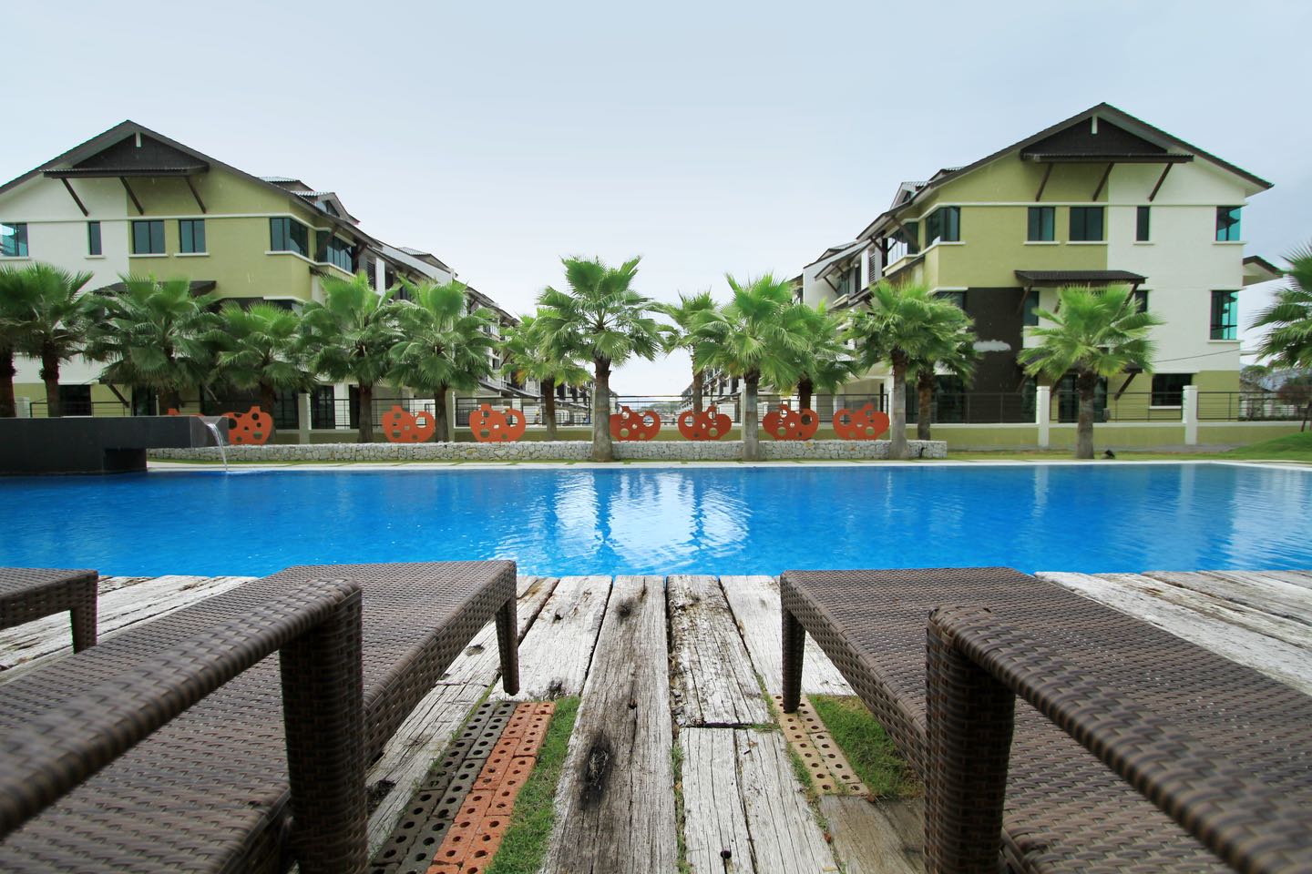俱乐部会所的主泳池设置了一个延伸的浅水池,泳池甲板由枕木建造,甲板上有日光浴睡椅和阳伞。