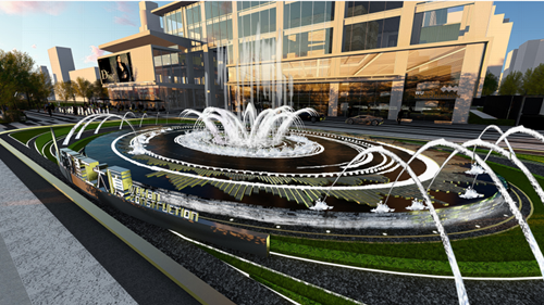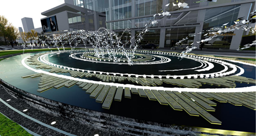 入口区景观特色在于极具设计感的中心水景,灵感来源于大地之环—年轮,通过一圈圈发散形的元素及刻有武建历史印记的符号语言,来表达武建企业的成长与发展,同时向心的设计更能体现武建企业的凝聚力。