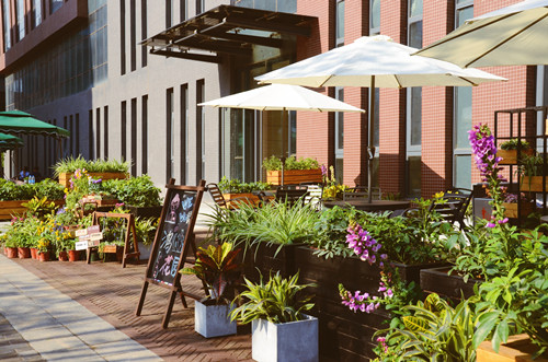 商业外摆区设置5组阳伞座椅,方便与客户洽谈,由花箱组合进行围挡,形成半私密空间。