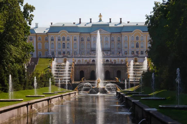 夏宫有“喷泉之都”“喷泉王国”的美称。花园的喷泉群包含37座金色雕像、29座潜浮雕、150个小雕像、64个喷泉及两座梯形瀑布。在蓝天白云的映衬下,华丽的喷泉熠熠生辉,光彩夺目。
