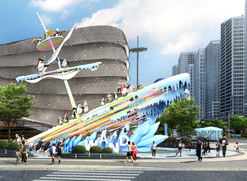 万达茂次入口与酒吧街隔街相对,通过打造水景音乐雕塑以实现两侧景观空间的“势均力敌”。水景以旱喷及喷水池两部分构成:旱喷广场结合场景音乐效果,实现提升区域人气,强化景观空间与使用者互动性的作用;喷水池结合主题雕塑、IP小品,打造故事化的景观空间,为万达茂室外景观之旅画上圆满的句号,打造了区域特色景观地标,从而实现万达茂两大入口广场的特色景观主题效果。