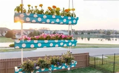这个直接在花棚里面布置一个吊盆,这个是三层的吊盆,准备一些废弃的PVC水管,一些吊绳了钉子,悬挂稳定之后就可以放上土壤栽种了,要注意保持稳定,摆放的位置要避风。