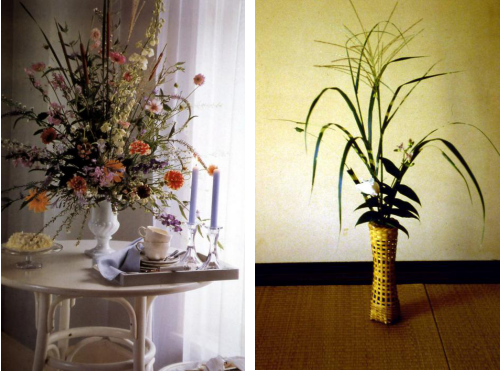 (2)插花:欧洲的插花,通常是体量偏大且颜色众多的,因为欧洲追求华丽,追求完全的状态。反过来日本的插花,一支花、一颗草也许所表达的并不是非常华丽的景象,但是反应了这个植物本身的生命力,把这个生命力完整的展现出来,使观赏者从这个生命力当中感受到个性的获得。