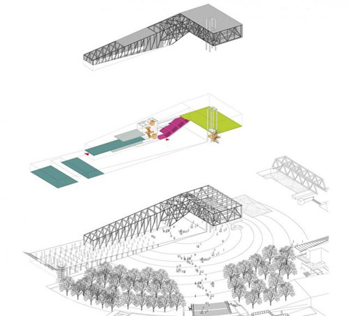 新展览中心把旧坡道改造成大型剧场活动空间,而长方形体块抬升后形成的有盖广场则可举办更亲密的聚会活动。