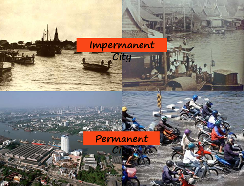 这里是一张曼谷的照片(图4),展示了城市发展的过程。大家有很多人去过曼谷,曼谷是最好玩的观光地,但是宜居性排在靠后的位置。曼谷跟河流的关系是沿着河流发展,在我们印象当中曼谷的河流应该是左边那照片,实际上却并不是这样,现在的这个河流正在逐渐地被我们城市建设所侵蚀。