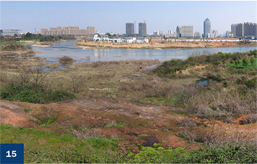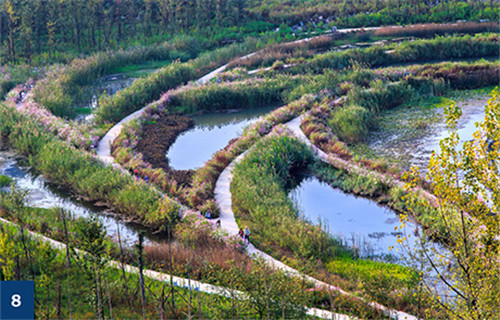 想象一下如果我们的城市摒弃非常高而坚硬的混凝土防洪墙,重新恢复农民古老的智慧,在河堤上开垦梯田种植蔬菜,并且借着水流的流动进行灌溉,那么城市的景观是怎样的?生态友好的解决方式是采用池塘和围堰蓄积低处的水,让自然慢慢去涵养水质,这样为动植物提供了栖息地,不但能形成丰富的植被,而且可以招来野生动物,水中的营养物质被自然的生态循环过程所吸收。中国很多城市都采用这样的方法来改造母亲河--长江的水质。(见图5-10)。